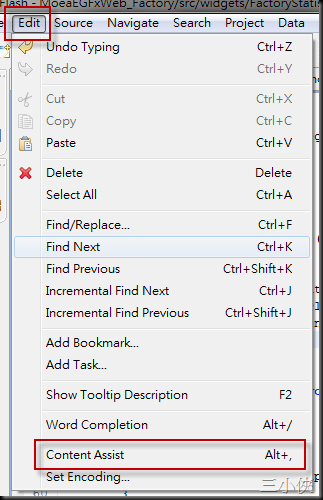 按圖施工後,我們可以在 Edit → Content Assist 來查詢對應的快捷鍵被修改了,參考下方圖片